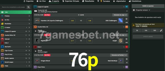 O 76p oferece uma grande seleção de opções de apostas em e-sports com probabilidades competitivas